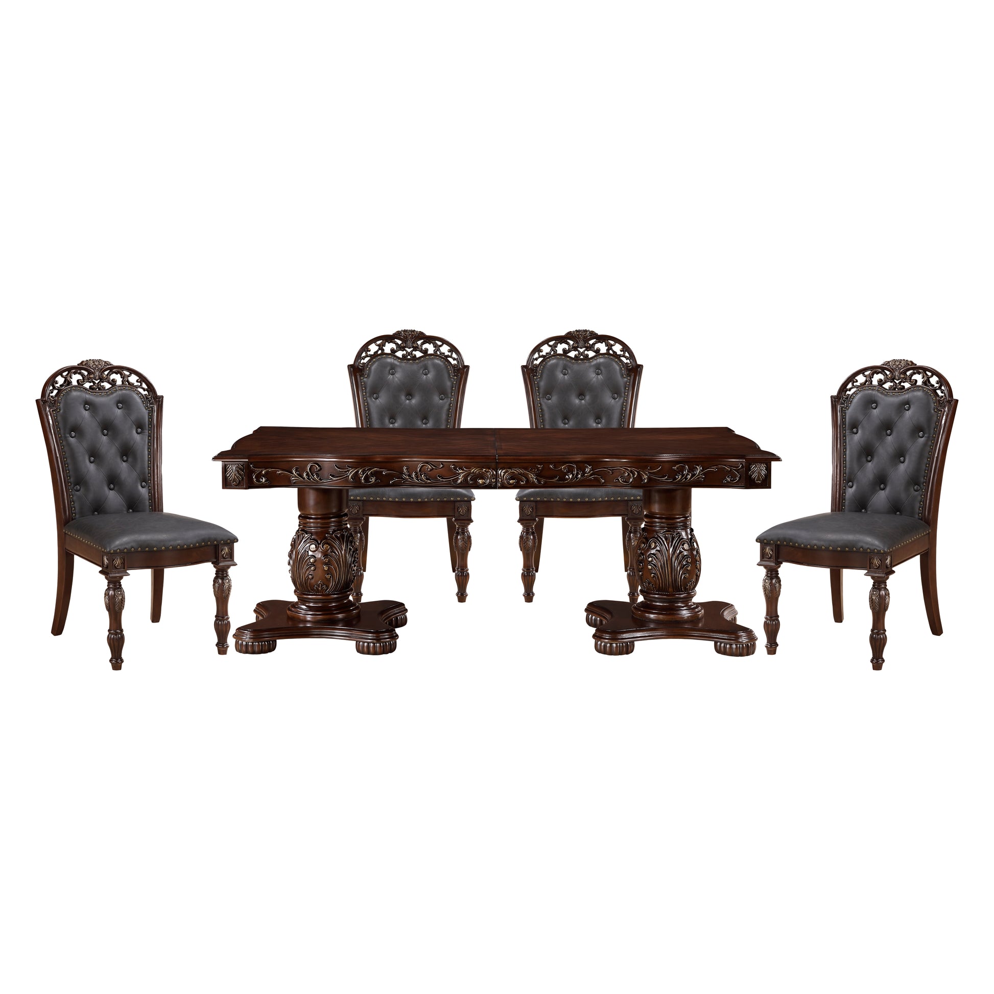 The Adelina Collection embodies Old-World elegance, combining intricate detailing with classic craftsmanship to create a sophisticated dining experience. This exquisitely designed set features ornate scrollwork on the table’s apron, double pedestal base, hutch, buffet, and chair frames, adding a touch of grandeur. The table showcases the rich grain of its birch veneer, while the arm and side chairs offer luxurious comfort with faux leather padded seats, button-tufted backs, and refined wood-framed profiles accentuated by nailhead trim. Traditional elements such as acanthus leaf carvings, bun feet, and serpentine-front buffet storage enhance the collection’s timeless appeal. The hutch, with its glass-fronted doors, glass shelves, and overhead touch lighting, provides an elegant display for fine china and décor. Finished in a warm cherry tone with gold tipping over birch veneer and pine solids, the Adelina Collection is the epitome of classic luxury, making every dining occasion a regal affair.