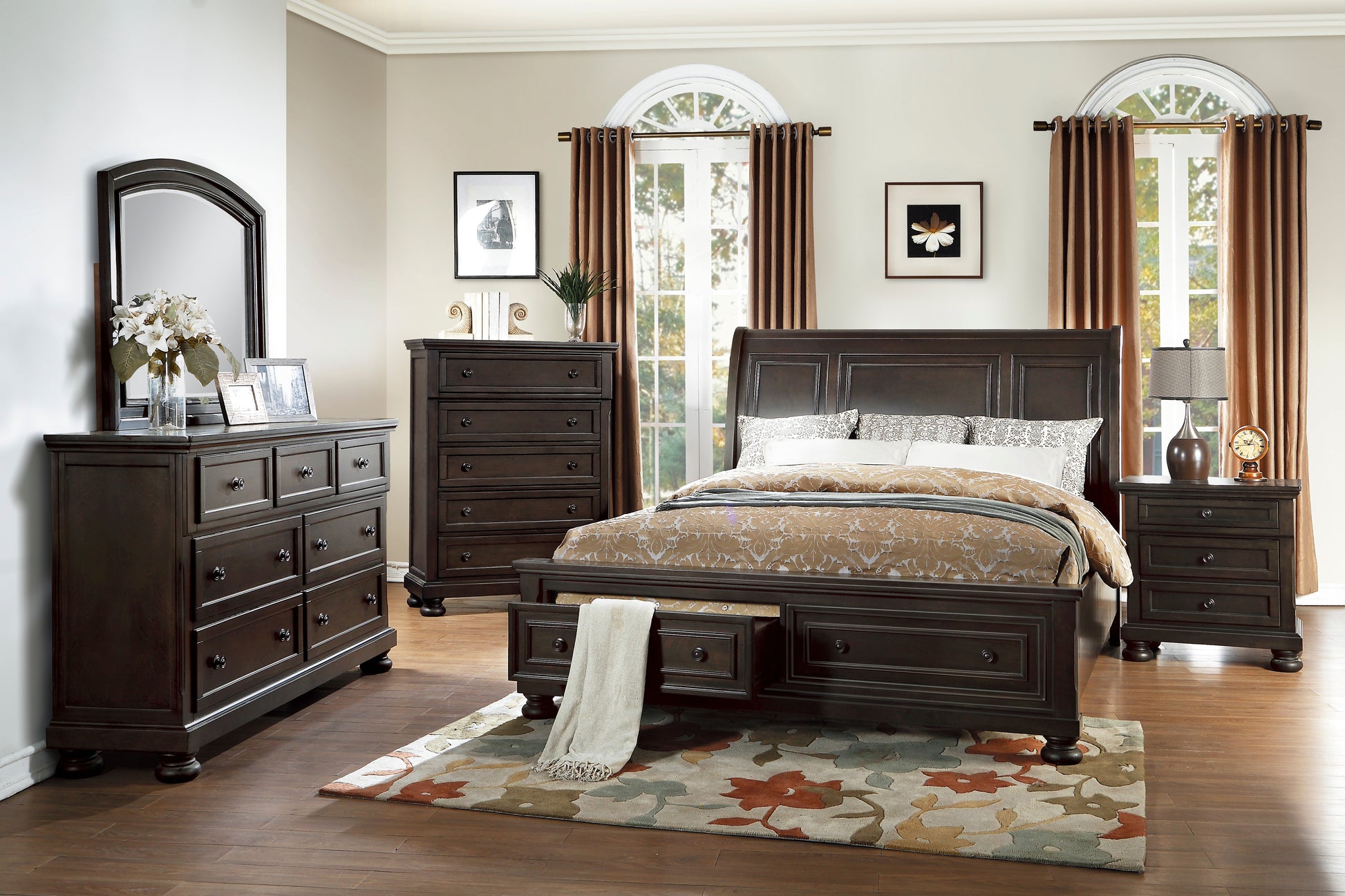 Casual transitional styling lends versatility to the placement of the Begonia Collection in a number of bedroom settings. The grayish brown finish lends distinctly to the execution of different looks from traditional to country casual, with knob hardware punctuating the look of each framed drawer front. Hidden drawers in the nightstand and dresser provide discrete storage for your valuables, while the storage drawers of the footboard provide a more visible means of additional storage capability. Bun feet support the case goods and a sleigh headboard finish off the transitional design of the collection.