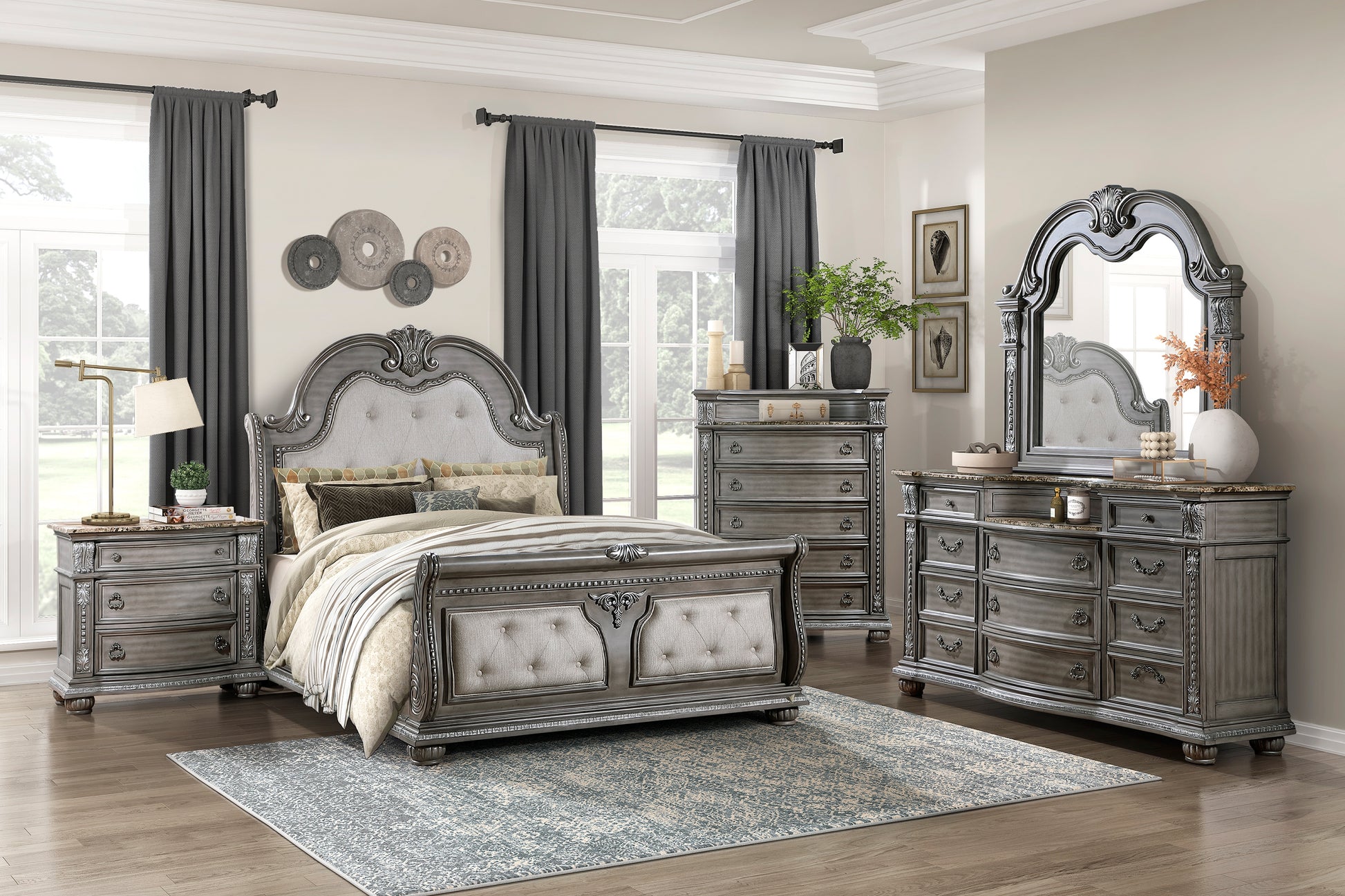 The luxurious grandeur that permeates the design of the Bennington Collection is an amalgamation of classic accenting and traditional lines. Carved bun feet, acanthus leaf carving, bead molding, and elegant framing account for the beautiful profile that defines the collection’s design. The grand sleigh bed serves as the focal point of your bedroom, with its headboard and footboard featuring button-tufted, gray textured linen-like fabric covering the central panels. Antique pewter-finished knob and ring pull hardware fronts the drawers of the collection while marble tops the dresser, chest, and nightstand. The elegant framing of the mirror follows the design of the rest of the collection, providing a timeless accent to your space. The gray finish, over acacia veneer, features subtle silver tipping for final luxurious accent.