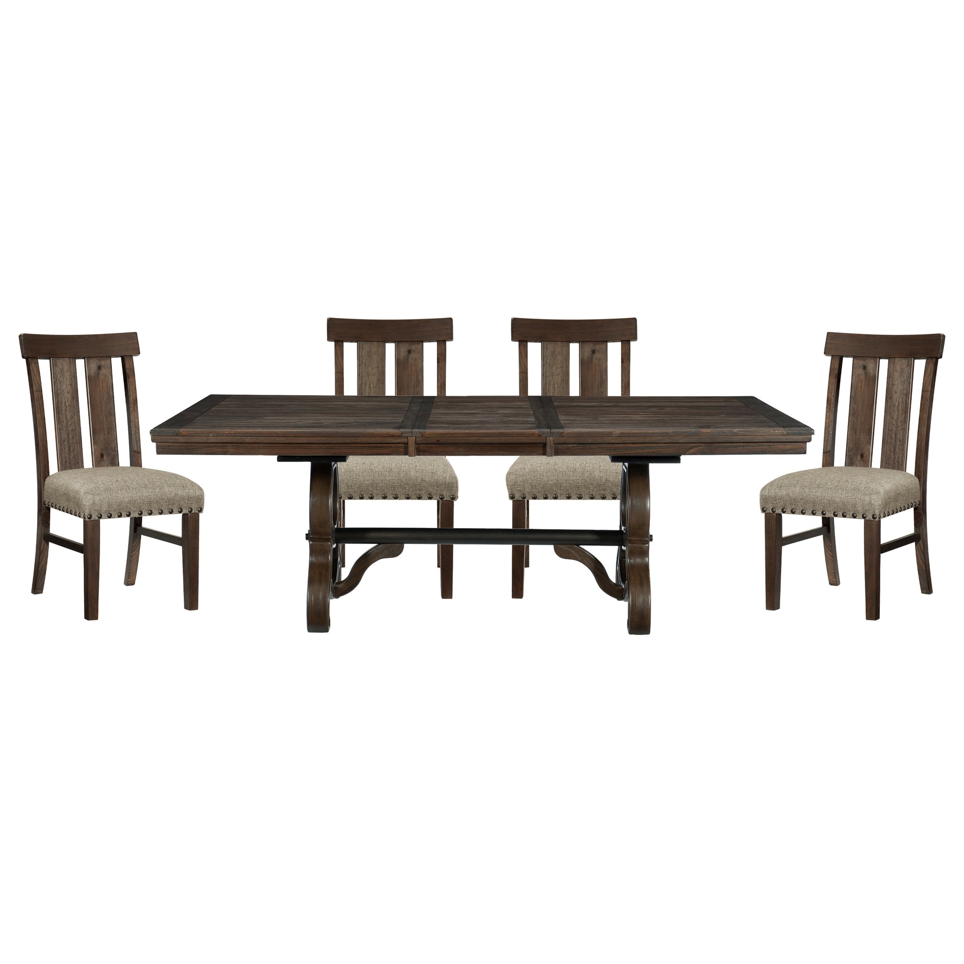 With styling that hints at times gone past, the Gloversville Collection’s stately presence will be the perfect addition to your dining room. The pine solids of the 86-inch table are supported by a distinct trestle base, its curves providing bold accent to the table’s top. The upholstered armchair is complemented by the wood framed side chair, each featuring a neutral toned fabric and nailhead accent. The wood bench takes design inspiration from old-fashioned church pews, its curved arms giving way to the unfettered seating.
