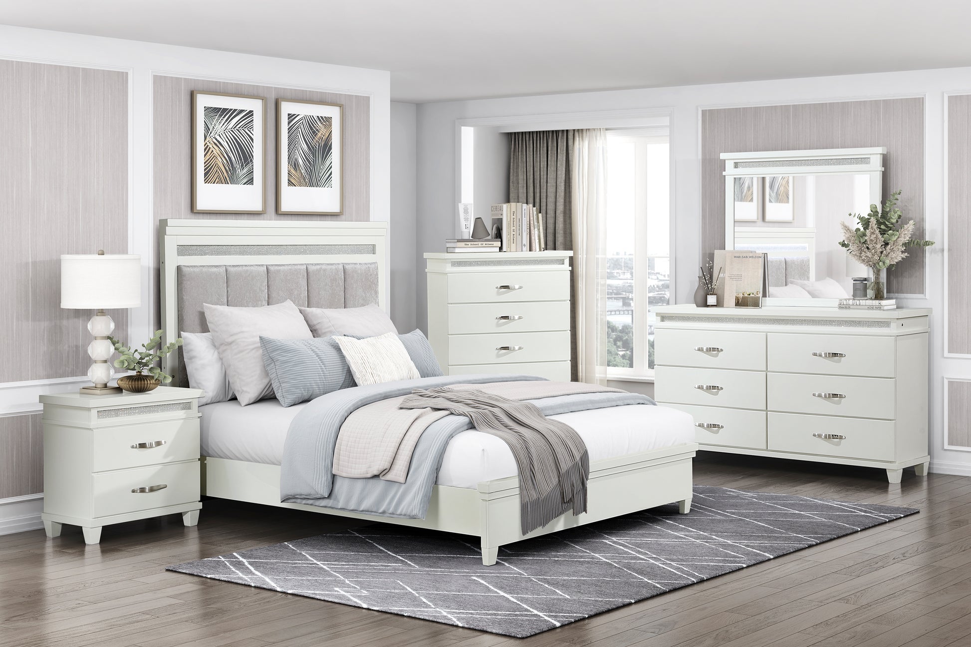 Each drawer of the tower units, dresser, and chest is adorned with polished chrome bar hardware, lending a sleek and contemporary touch while ensuring effortless access to your essentials.