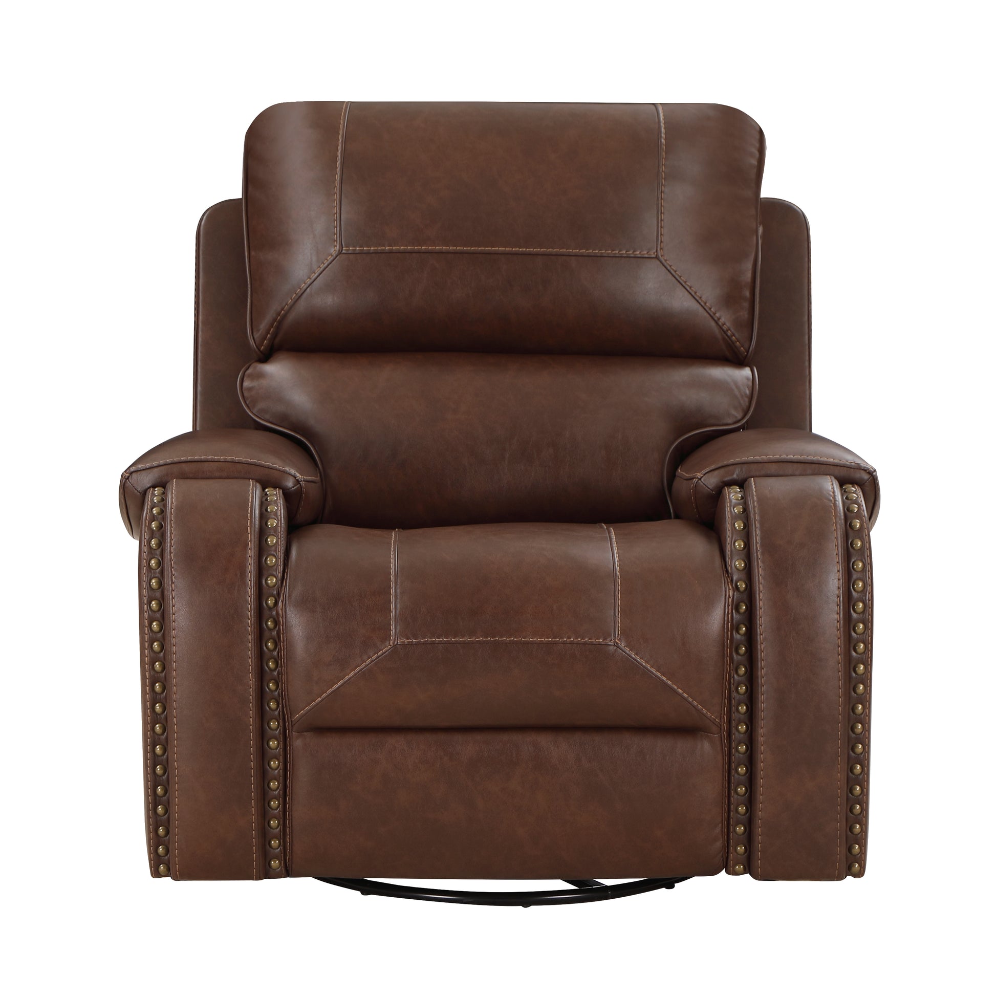 Introducing the Shawdowfax Collection, where classic nailhead accents meet a transitional silhouette for a timeless aesthetic. This collection boasts a swivel glider reclining chair featuring manual reclining mechanisms for effortless transitions from seated to reclined positions. The chair completes the set with a 360-degree swivel base and manual reclining motion mechanism. Upholstered in brown breathable faux leather, this collection effortlessly complements any home décor with its neutral hue.