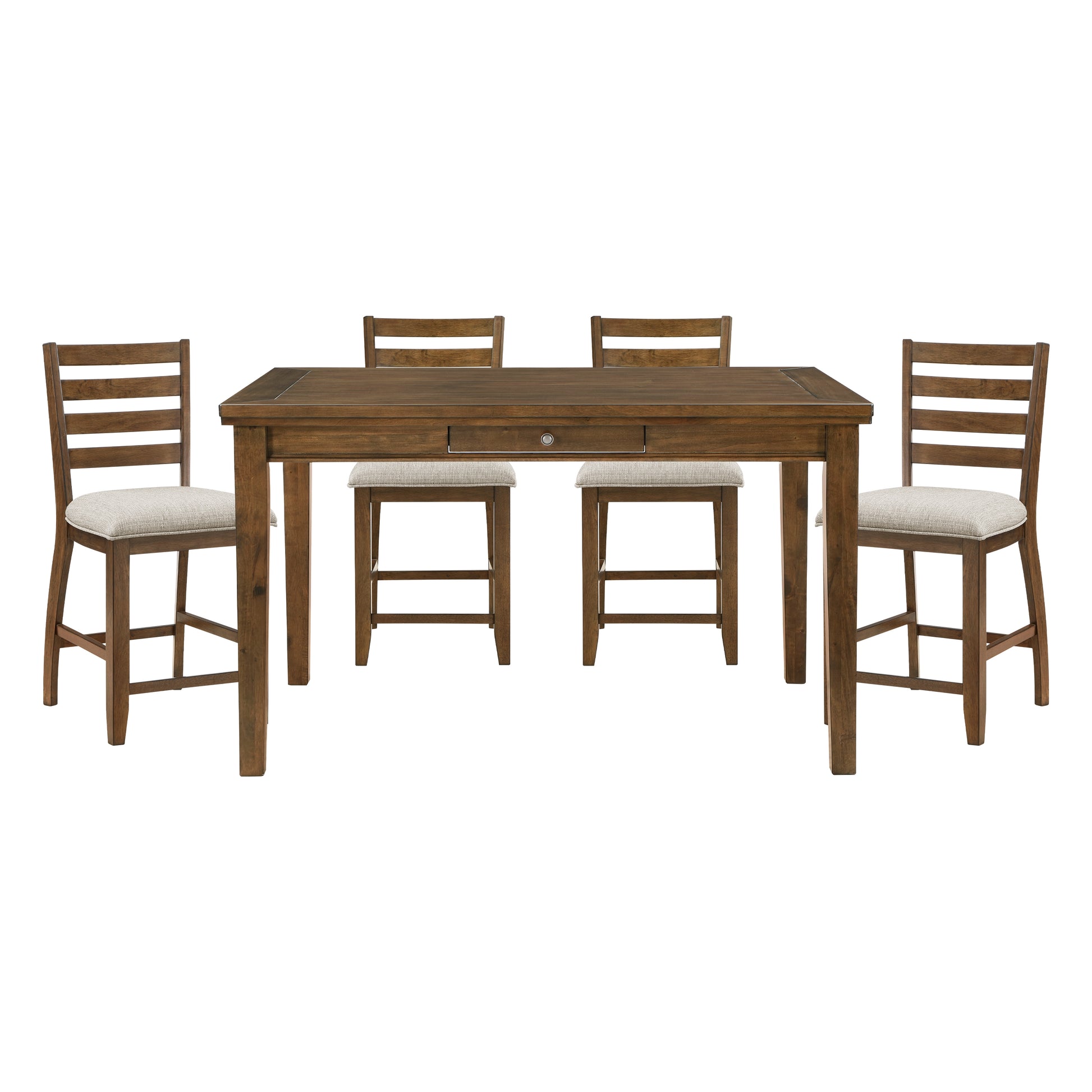 The centerpiece of the collection is the framed plank counter-height tabletop, offering a classic yet sturdy design perfect for family meals or casual gatherings. The ladder-back counter-height chairs complement the table with their elegant silhouette, while the neutral-tone fabric upholstery on the padded seats adds comfort and versatility.